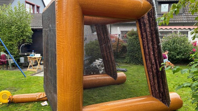 Was bedeutet das? Gemäß DIN-Norm sollte rund um die Hüpfburg ein Sicherheitsabstand von 1,80 m eingehalten werden, sowie 3,50 m vor der offenen Seite. Diese Vorgabe dient der Sicherheit, die Einhaltung liegt jedoch in eigener Verantwortung.